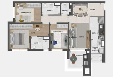 Planta opção do apto. de 76 ou 79 m² - 3 dorms.