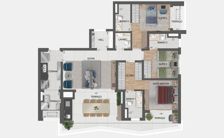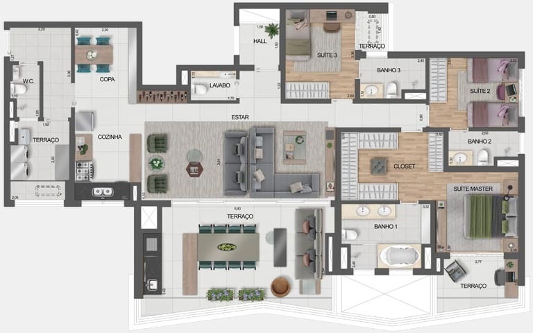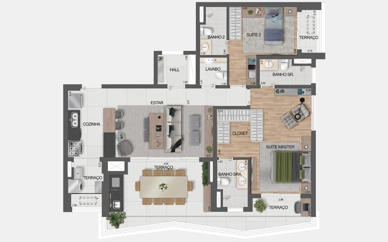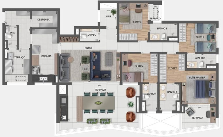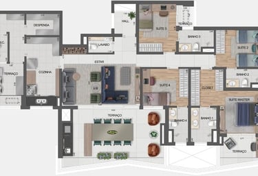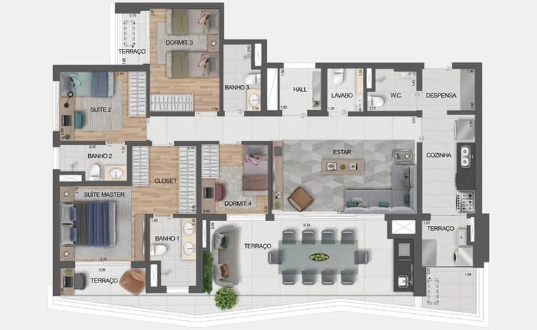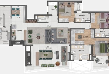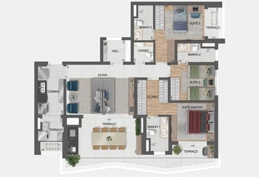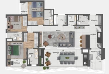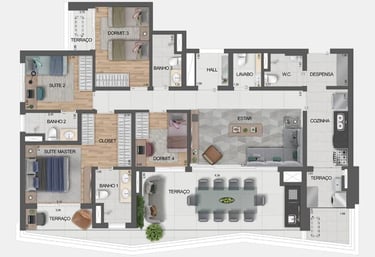 Planta opção do apto. de 144 m² privativos com sugestão de decoração