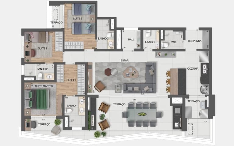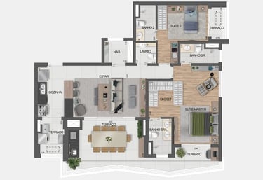 Planta opção do apto. de 120 m² privativos com sugestão de decoração