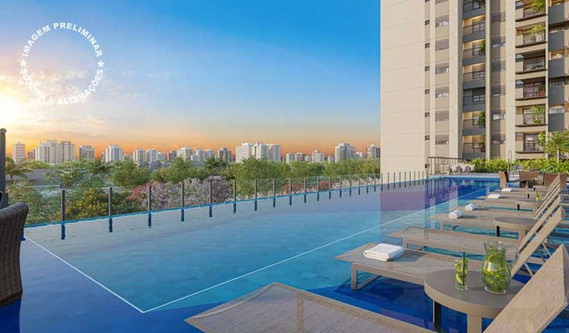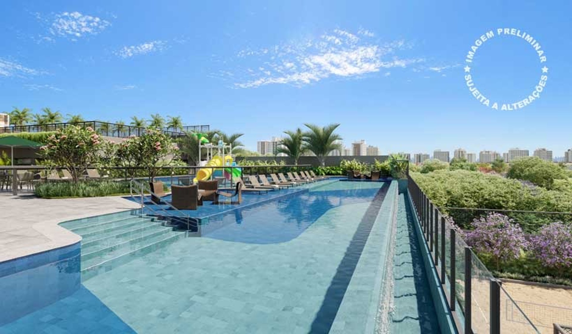 Piscina de 25 m com borda infinita e vista para o parque