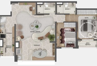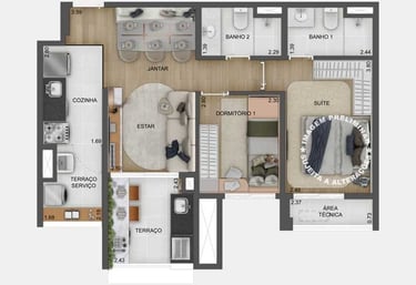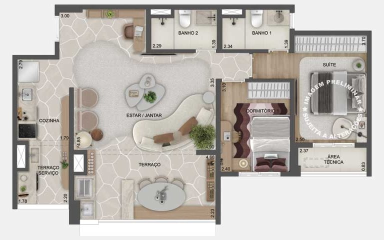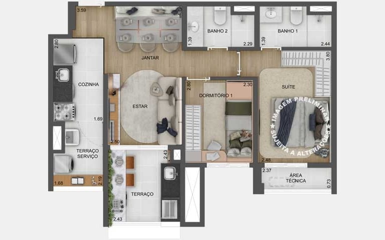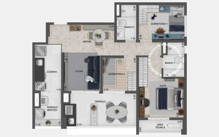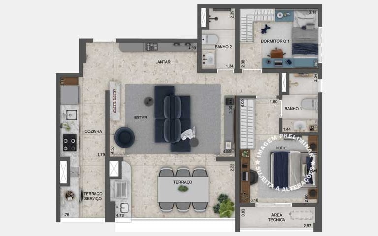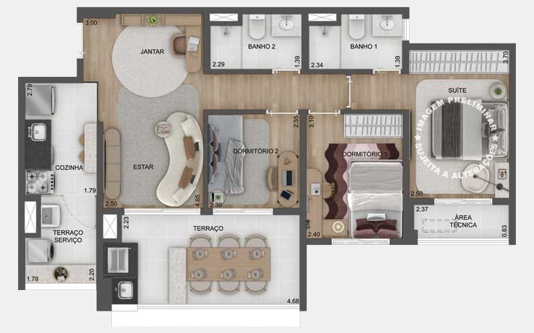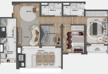 Planta opção de 79 m² com living ampliado